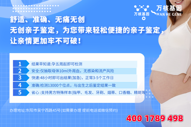 在科学面前真相只有一个,东阳万核亲子鉴定中心抱着这样的信念,怀着对DNA科技的景仰和虔诚的这一个的目标,我们走出了一条严谨而深远的道路.....,我们采用严格技术标准为社会各界提供亲子鉴定和个人身份识别的服务,出具的个人隐私鉴定报告负法律责任,在可轻松办理亲子鉴定、东阳个人隐私亲子鉴定、移民亲子鉴定、上户口亲子鉴定、亲缘亲子鉴定、孕期亲子鉴定(孕5周即可检测,安全放心,保护客户隐私,覆盖全国)报告国内外通用,正规亲子鉴定机构。